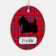 A black scottish terrier against a red plaid pattern decorates this holiday ornament. Customise this ornament by adding your pet's name. Use this cute scottie dog ornament as a Christmas tree decoration, holiday decor, Christmas decor, a gift, gifts, etc....The designs are from original art.