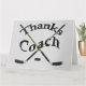 Cheap hockey coach gifts with two hockey sticks and a hockey puck with "Thanks Coach" in a cool beveled lettering on the inside and outside of the hockey cards.