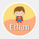 Make everyday labeling feel like a superpower with these personalized kids name stickers featuring a cheerful cartoon superhero in red and blue, complete with a smiley emblem and a bright yellow-peach background.