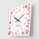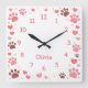 Brighten up any room with this sweet and customizable square wall clock! Featuring a lovely, playful border of various pink and brown paw prints interspersed with charming hearts and sparkling details, this clock is perfect for any dog or cat lover. The center features a customizable area where a name, like "Olivia" in the example, is prominently displayed in a pretty pink font, making it a truly personal and heartfelt piece of decor. Against the clean white background, the pink numbers and accents stand out clearly. This clock makes a wonderful housewarming gift, a beautiful addition to a nursery, or a thoughtful way for any pet owner to celebrate their beloved furry friend.