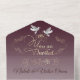 a classic design for invitation with a magnificent and elegant dark purple gradient texture and two doves with rings surrounded by sparkle with golden text for a simple wedding.