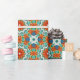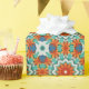 A pattern crated from cut paper shapes, like the Japanese art of paper-cutting known as kirigami. The lovely colours include a blue-green or turquoise, classic blue, a muted orange and a rust shade.