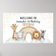 Create a charming focal point for your little one's milestone birthday with this adorable Neutral Safari Animals 1st Birthday Paper Poster. This delightful design features soft watercolor illustrations of a giraffe, elephant, lion, and zebra peeking out from gentle clouds, centered around a stylish, neutral boho rainbow. Sprinkled with subtle faux gold glitter confetti accents, this poster perfectly captures a whimsical, elegant jungle/safari theme. It's an ideal, personalized decoration to welcome guests or display as a backdrop for photos at your baby girl's or boy's first birthday celebration. Easily customize the name and age to make it uniquely yours.