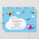 Cute aeroplanes and helicopters fly through the air against a blue on blue pinstripe background. A fluffy, white cloud holds your personalisation. An adorable invitation for a little boy's birthday. (FP)