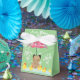 A baby shower theme features a cute, African American baby with a cheery red umbrella. The baby sits among a flock of yellow rubber duckies in a sprinkle of pastel hearts and gentle rain. Available in a pink or blue or neutral green theme along with an original, adorable collection of baby shower decorations, baby shower games and baby shower favours for an original, whimsical welcome baby celebration.