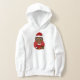 A hoodie with an illustration of a cute smiling African American boy with short black hair, the boy is wearing a Santa Claus costume with a red hat and holding a present; in a red circle on a white background, a Christmas holidays design