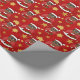 Christmas wrapping paper with an illustration of a cute smiling African American boy with short black hair and glasses, the boy is wearing a Santa Claus costume with a red hat and holding a present; in a red circle on a red background with stars, a Christmas holidays design with an editable text template for your name or message