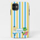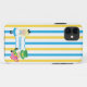 Cute Alice in Wonderland custom iPhone 11 case gift for a book lover or librarian. Little girl Alice in her blue dress and the Mad Hatter sit on pretty blue and yellow stripes on this whimsical phone case.