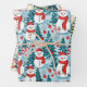 Three sheets of cute snowmen in the winter wonderland forest. Christmas wrap with snowmen in warm red scarves and warm knit hats and a pretty green, red and blue pine tree background.