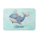 This personalised bath mat features a cute whimsical whale in a vibrant pink and blue colour scheme swimming playfully with a tiny hat.