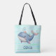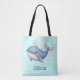 This personalised tote bag features a cute whimsical whale in a vibrant pink and blue colour scheme swimming playfully with a tiny hat.