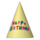 A variety of coloured letters form the words Happy Birthday on a bright yellow party hat.