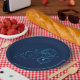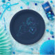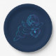 Paper plates with a sweet baby cherub holding a lace heart. Drawn in bright neon blue and purple colours set on a blue background.