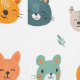 Adorable animal faces in a seamless pattern featuring cats, bears, and other woodland creatures, accented with scattered leaves on a white background. Perfect for kids' designs and nursery decor.