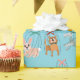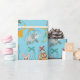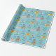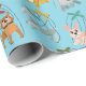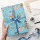 This cute wrapping paper features a pattern of cute animal marionette puppets against a light blue background. There's a cat marionette, a dog marionette, a goat marionette, a bird marionette, a rabbit marionette and an elephant marionette.