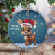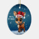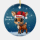 Cute animal reindeer character, baby deer with antlers and personalizable Santa hat with festive blue snowy backdrop. Unique winter wildlife graphic with a light snow. Round ceramic ornament, with customisable Merry Christmas written in white. for decorating your holiday tree or as a thoughtful gift, this whimsical woodland doe decor makes a cherished keepsake for years to come. Customise by changing the text, the font, the font colour, or remove the text. You can even transfer this cartoon fawn illustration onto other products. Enjoy this design your way! 🎄🦌