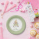 This army green gender-neutral baby shower paper plate features a cute illustration of baby animals (lion, elephant, zebra, monkey and giraffe) piled into a safari vehicle and the mother's name and "Baby Shower" in coordinating army green script. Perfect for drive by baby showers.