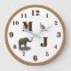 Cute Animals Monogrammed design features monogram in large, clear lettering. Clock numbers are displayed in easy-to-read print, the 12, 3, 6 and 9 slightly larger than the rest of the numbers. Image of a friendly elephant and curious kangaroo are displayed against a white background. Entire design is encircled in a brown ring. Available in a variety of colours.