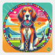 Adorable cartoon-style illustration of a dog with bright eyes, wearing a collar and chain, set against a coloured circular background.