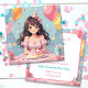 Pretty pink and teal anime girl with birthday cake and balloons themed birthday invitations. Pink, blue floral background.