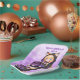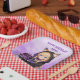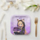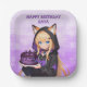Cute personalized birthday paper plates for a girl's birthday party. A sweet anime girl in a fox ears hoodie holding a purple and black birthday cake.