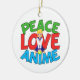 A cute manga Christmas ornament gift for someone who loves japanese animation. Peace Love Anime in green, red, and blue with a beautiful blonde schoolgirl in a blue sailor outfit.