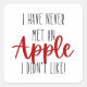 Make a delicious 'International Eat an Apple Day' with unique Apple art printed on Square Sticker. This sticker has 'I have never met in apple, I don't like!' cute quote design. You can buy this sticker in 2 different sizes with glossy and matte finished.