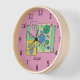This clock is decorated with three cute doodles of plants, each inside their own border, on a pink background. The main colours are green and blue. You can add any name, and it would be a very suitable gift for a gardener or florist. The clock has a pale wood border. The artwork is original mixed media drawings, and only available from The Art of Being Beth.