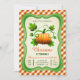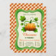 Amaze your guests with this cute autumn birthday party invite featuring a beautiful pumpkin with modern typography against an orange gingham background. Simply add your event details on this easy-to-use template to make it a one-of-a-kind invitation. Flip the card over to reveal an orange gingham pattern on the back of the card.