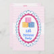 Birthday Party invites with a cute baby ABC building blocks in yellow, pink and blue with a pink and white zig zag background and pink and blue polka dot frame. This fun design looks great on all the stationery items in our store and will bring a smile to everyones face.
