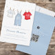 This design features a cute baby boy whimsical blue, a simple minimalist minimal typography, with a scannable QR code for website URL or link, or Facebook social media event page, stylish trendy calligraphy script, sweet denim blue jeans boys, a baby boy clothes t-shirt, a white red boys t-shirt, a watercolor simple boys clothesline, a rustic country blue jeans, a mummy to be a baby shower, with it's a boy quote saying with gift registry store website online.