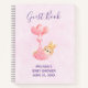 A personalised spiral guestbook with an adorable illustration of a little brown baby bunny wearing a tiny golden crown. Carried by balloons in a pink heart blanket.
