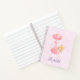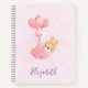 A personalised spiral notebook with an adorable illustration of a little brown baby bunny wearing a tiny golden crown. Carried by balloons in a pink heart blanket.