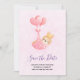 Save the date card with an adorable illustration of a little brown baby bunny wearing a tiny golden crown. Carried by balloons in a pink heart blanket.