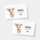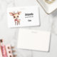 Name tag with an illustration of an adorable baby deer. Big eyes big ears with a large head and little brown antlers. Wearing a big red bow.
