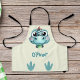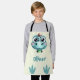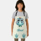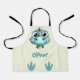 This super cute baby dinosaur face personalised apron features a cheerful, blue cartoon dino with big eyes, blushy cheeks, and playful spots and its footprints.