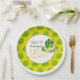 Cute baby Dinosaur hatching from an egg is the theme of this baby shower, new baby partyware item. Add names, date, event as desired to the template fields. Green and yellow tropical palm leaf pattern and modern trending typography complete this fun baby boy or girls shower look. For matching items view the attached collection of contact Designer LeahG.