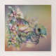 This magical and enchanting jigsaw puzzle features a colourful fairytale theme. A rainbow coloured dragon egg is printed in the centre with a cute baby dragon standing next to it. A garden of flowers, and a butterfly are planted below the egg. The background is a faded rainbow gradient pattern.