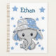 Adorable baby elephant sitting happy, with his little hat and stars.