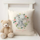 A cute personalised throw pillow for a baby girl, this design has an adorable baby elephant surrounded by a wreath of pastel pink and white roses and greenery. The background colour is a neutral pale ecru. A text template is included for personalising with your child's name. This pillow is available in 2 sizes: 16" or 20" diameter and in 2 fabric choices: polyester or cotton.