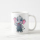 Mug with a cute cartoon elephant with large blue eyes and rosy cheeks is waving cheerfully.