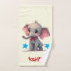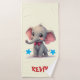 An adorable baby elephant wearing a red bow stands between two blue stars on this bath towel set for a toddler or baby.