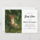 Baby shower invitation with a photograph featuring a cute little baby fox with red and white fur. Surrounded by lush green leaves and grasses.