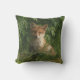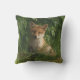 Pillow with a photograph featuring a cute little baby fox with red and white fur. Surrounded by lush green leaves and grasses.