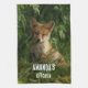 A kitchen towel with a photograph featuring a cute little baby fox with red and white fur. Surrounded by lush green leaves and grasses.