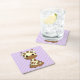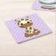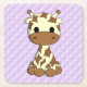 These coasters shows a baby giraffe cartoon with big black eyes on a geometric purple background. The giraffe is so cute it will please all young and elder women.