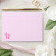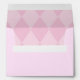 A cute baby shower envelope for a precious baby girl with a pastel pink argyle pattern background, embellished with sweet little baby footprints and a trendy pink ribbon tied into a bow. Flat printed image, not actual ribbon.