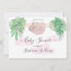 This charming baby shower invitation features a sweet baby sloth hanging from a branch, framed with green watercolor jungle leaves and pink clouds.