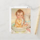 A charming vintage postcard featuring a cute baby having a bath in a bowl. Feel free to add a name, a date or any text you like.