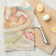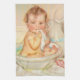 A charming vintage kitchen towel featuring a cute baby having a bath in a bowl.